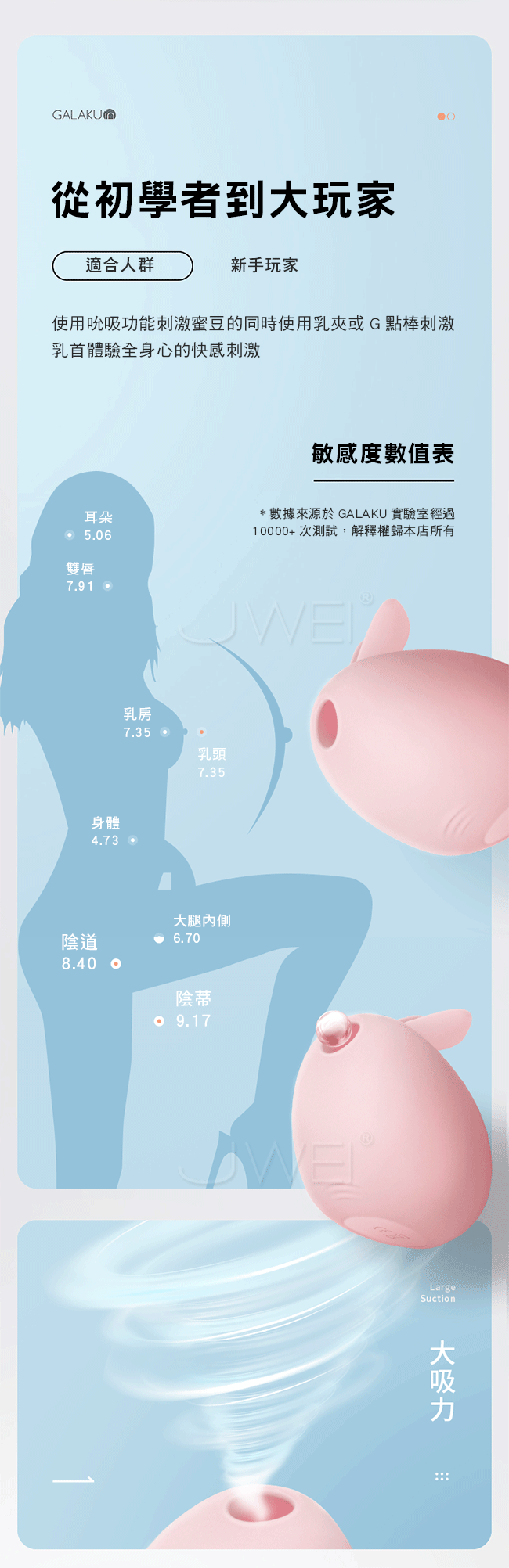 萌寵在手多重愉悅,嘴部精準包裹逗豆,喚醒豆豆深處8000條敏感神經~女生的小豆豆富含敏感神經,羞羞噠小惡魔的吮吸口正是為它而生,小嘴緊緊包裹豆豆,靈活又有勁兒。一體成型甚至可以邊洗澡邊使用喔~
