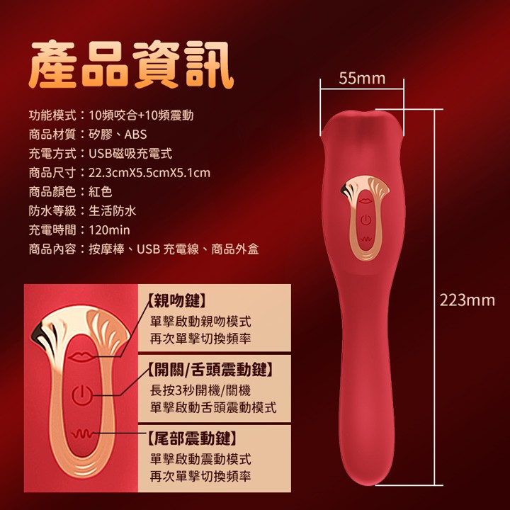 ►您現在的位置:首頁>吻慾潮 10頻咬合親吻+10頻震動舌舔 吮吸G點按摩棒 - USB磁吸充電式