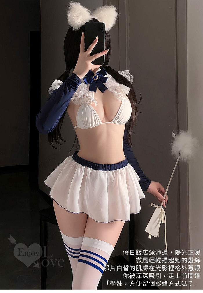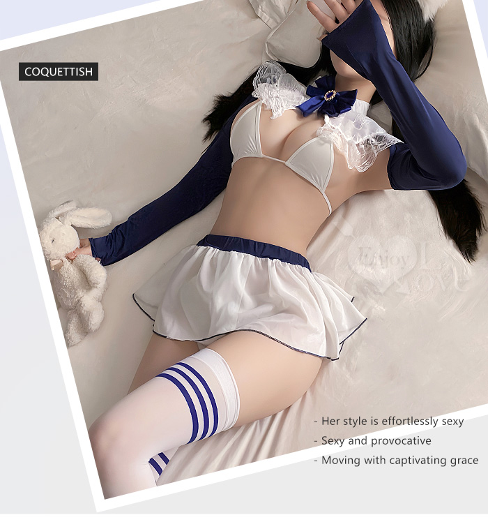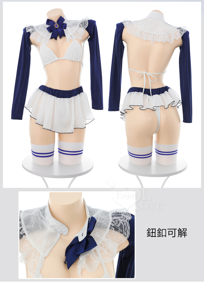 「學院藍絲」立領花邊比基尼 × 透紗露臀小短裙 裸背含襪三件組