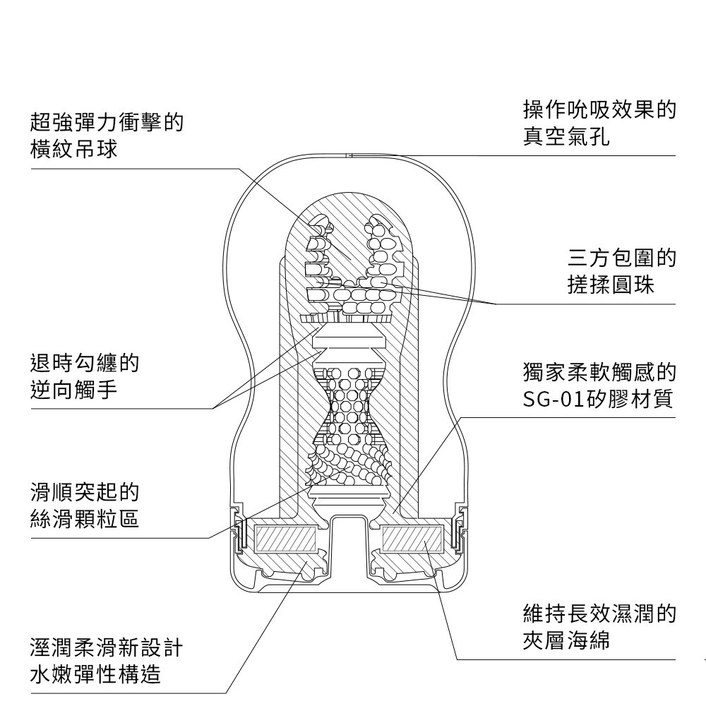 獨家開發柔軟材質,在溫柔的彈力包覆下,對前端黏密纏繞。