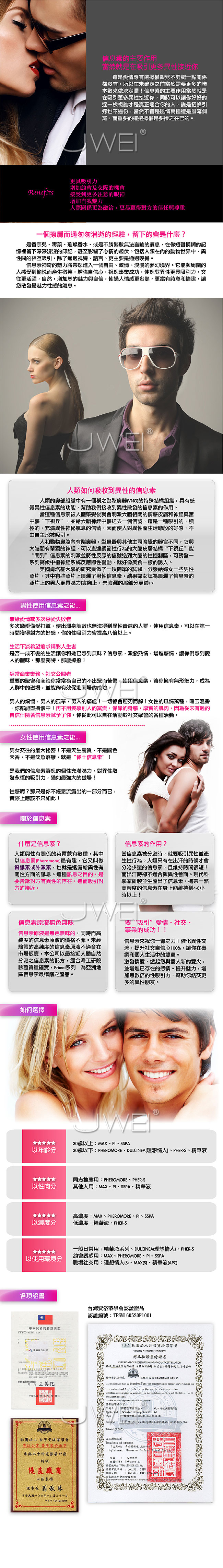信息素原液無色無味,未經驗證的高純度的信息素原液不適合在市場販賣,本產品以最接近人體自然分泌之信息素配方,經台彎工研院驗證質量確實,Primal系列為亞洲地區信息素最暢銷之產品,讓您對異性散發永恆的魅力!