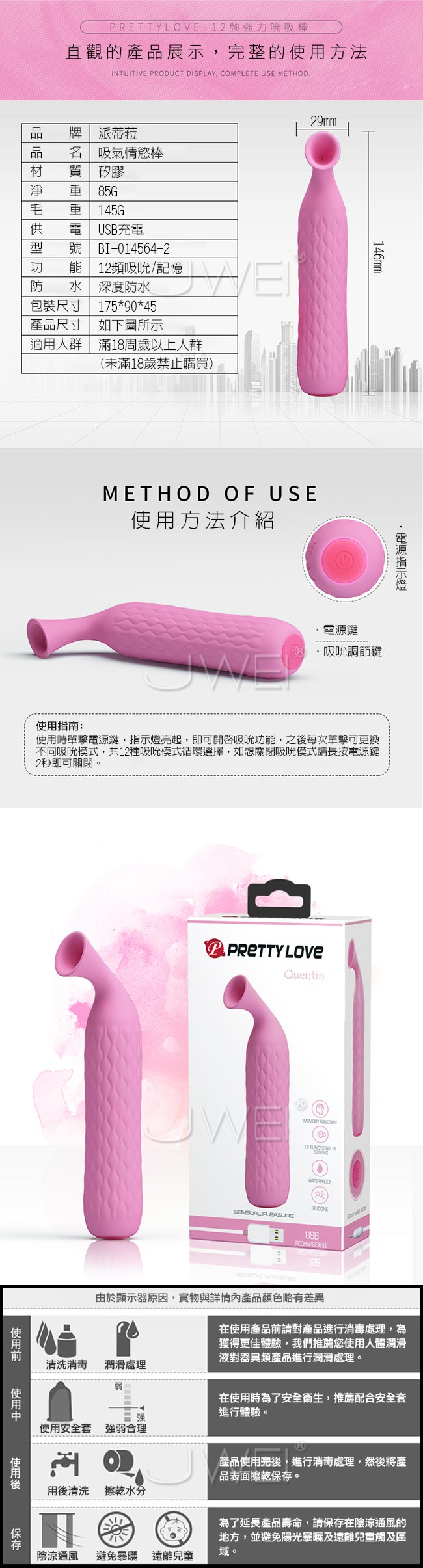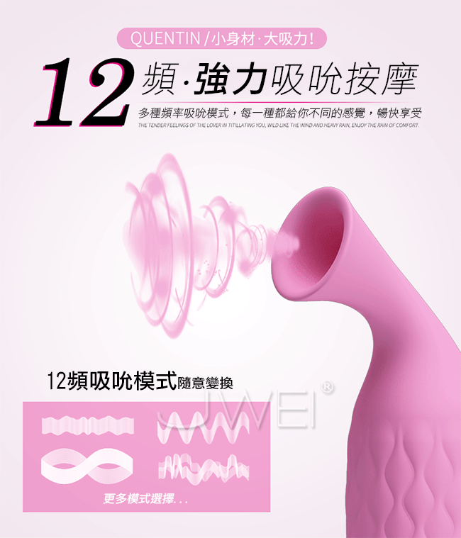 輕靈美感與純靜顏色合而為一強大的功能告訴你它不是一個花瓶!強力時尚吸吮按摩棒擁有12段變頻模式等您來切換,彷彿愛人的蜜唇般充滿魔力讓您欲罷不能!!小巧便攜的造型方便外出攜帶,小巧的吸吮按摩器功能強大,讓您出門在外也能滿足自己的慾望。符合人體工程學設計柔軟親膚材質吸頭,觸感舒適可配合強勁吸吮進行按摩,棒身優雅溫花紋美觀同時增加摩擦力方便手中使用!底部開關設計可調節頻率避免誤觸切換頻率。採用防水設計,方便清洗讓您在浴室裡也能使用享魚水之歡唷~靜謐低噪設計讓您在安靜環境內盡享愛的私密空間!USB充電續航方便,支持多種方式充電無論何時何地讓快樂不斷電!