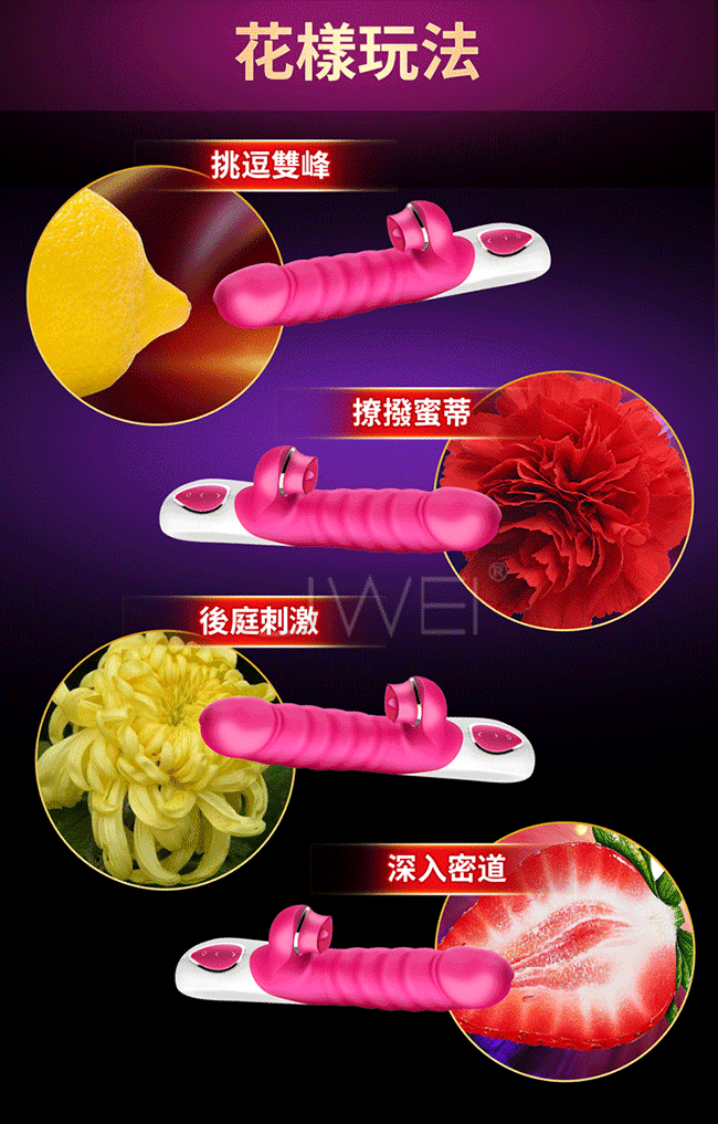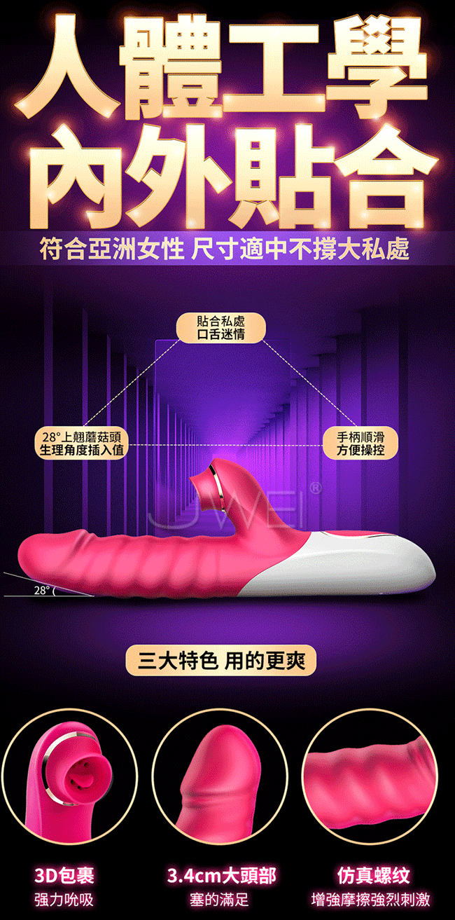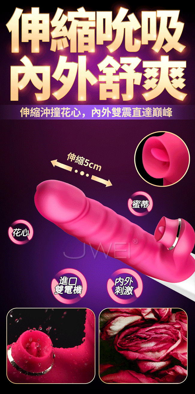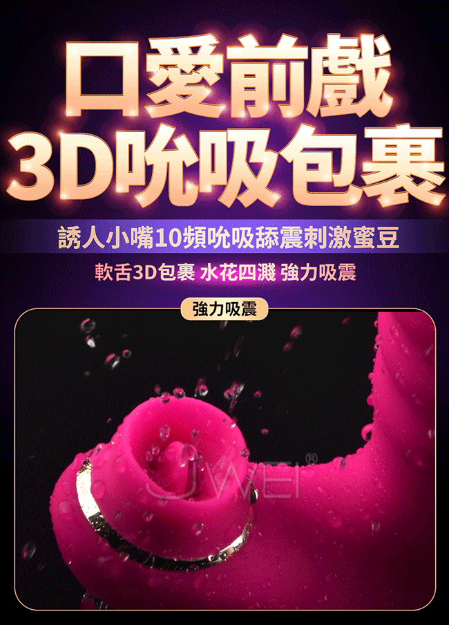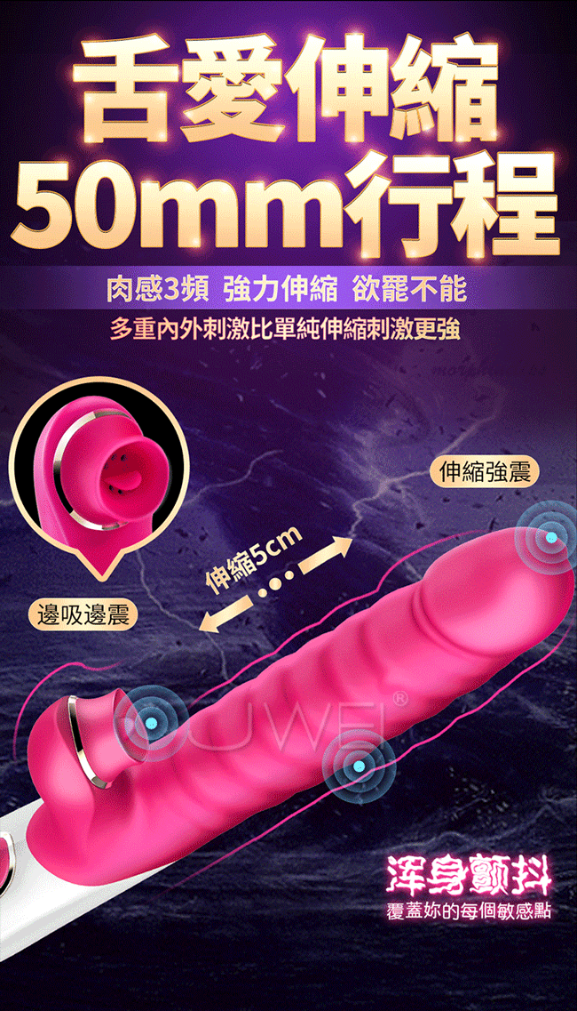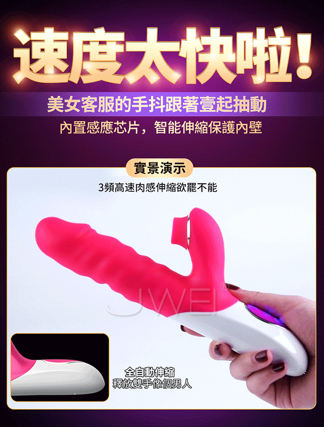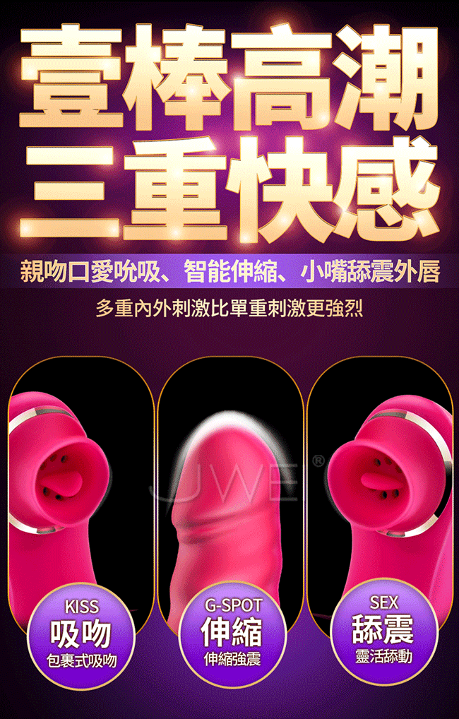 讓您從此告別單一刺激,讓您邊吸邊震混合爽一棒多用。多種頻率速度可多重內外刺激比單純伸縮刺激更強覆蓋您全身的敏感點喔~且採用液態矽膠製成使用上更柔軟更親膚,符合人體工學不怕撐大私密部位喔~擁有貼心靜音防水設計,只有呻吟沒有聲音,讓您可安心享受私密時間喔~