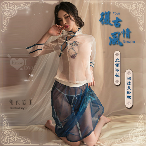 ►您現在的位置:首頁>情趣睡衣!中國風情復古立領印花裸透長紗裙三件組﹝藍﹞