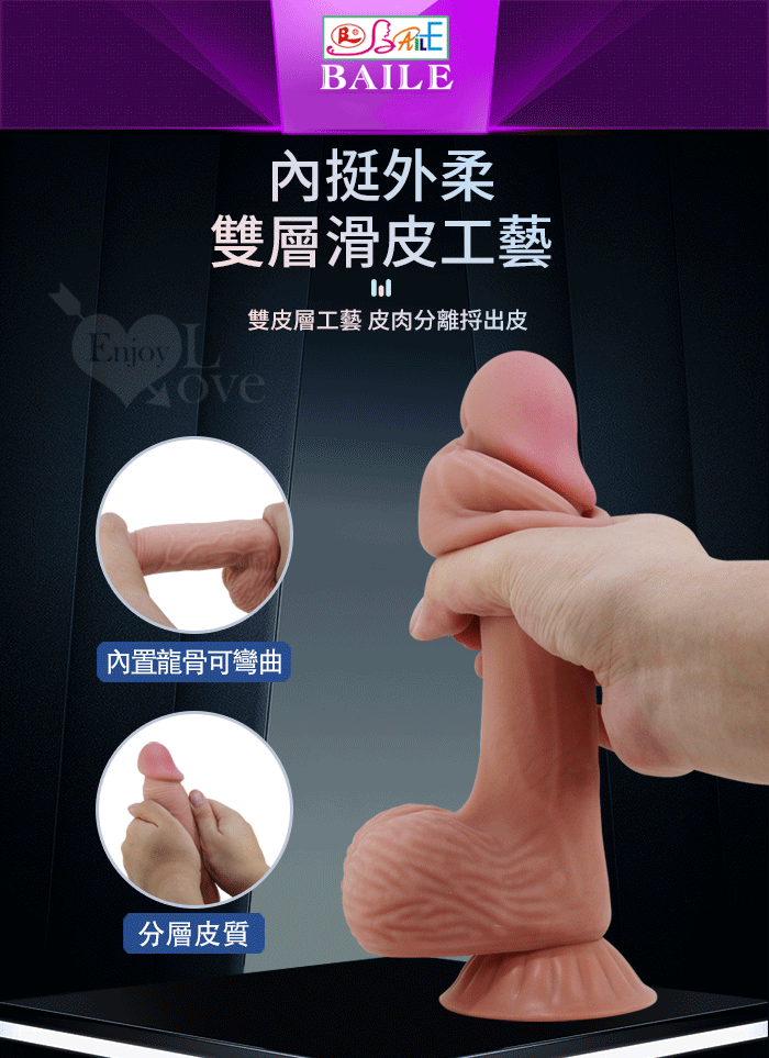 【BAILE】LISLE 利斯爾 內挺外柔 8.1吋雙層滑皮工藝 仿真膚質吸盤老二棒-棕色﹝內彎曲龍骨﹞