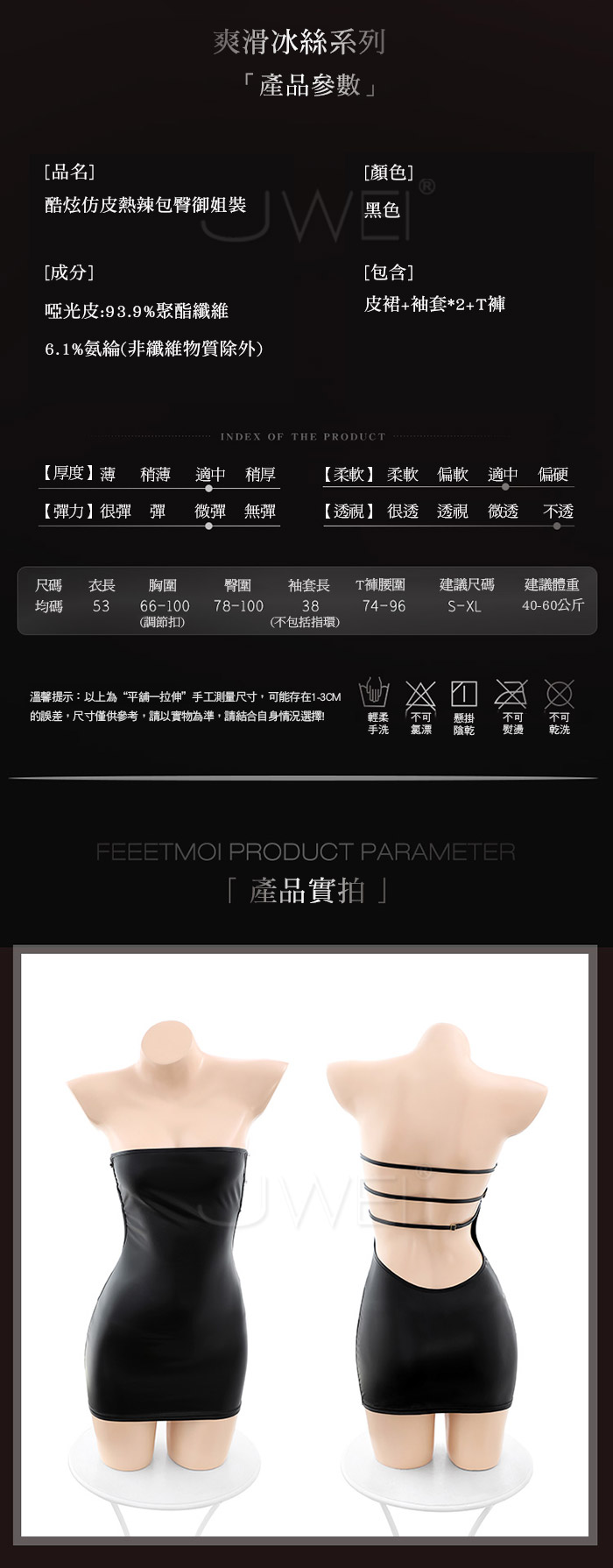 ■內容物:皮裙x1、袖套x2、T褲x1