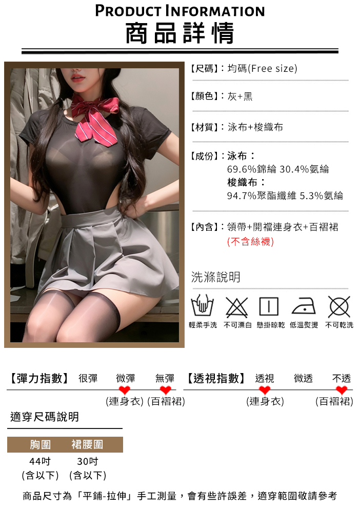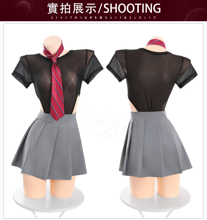 | 學生角色扮演服!純慾蝴蝶結高衩可開襠透視連身衣百褶短裙三件組