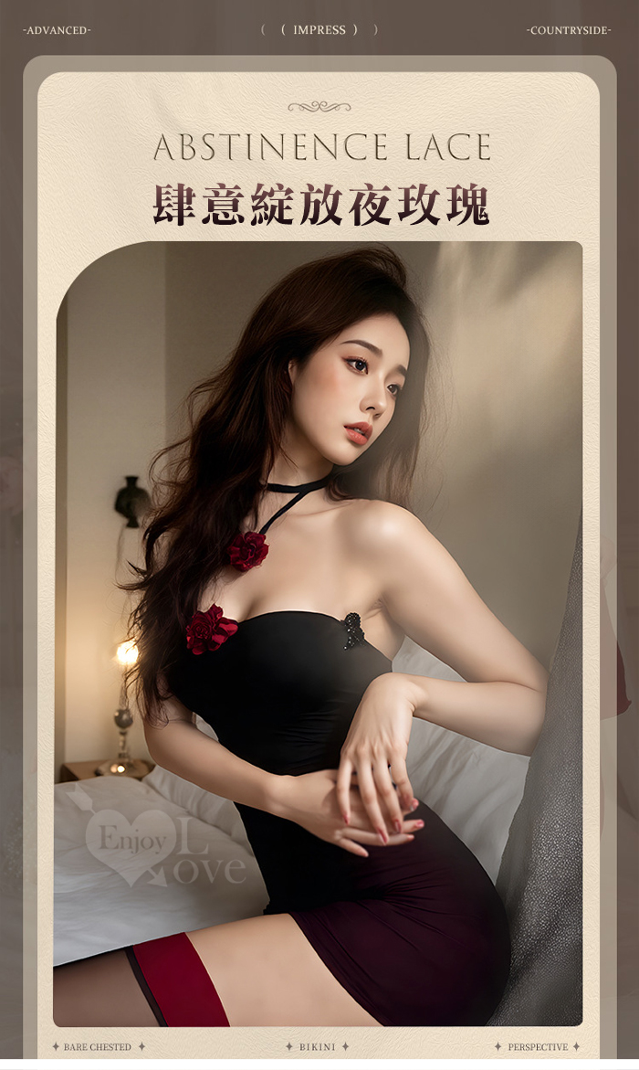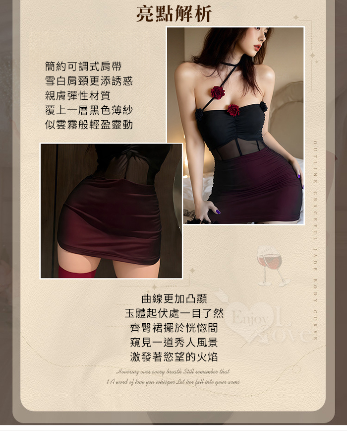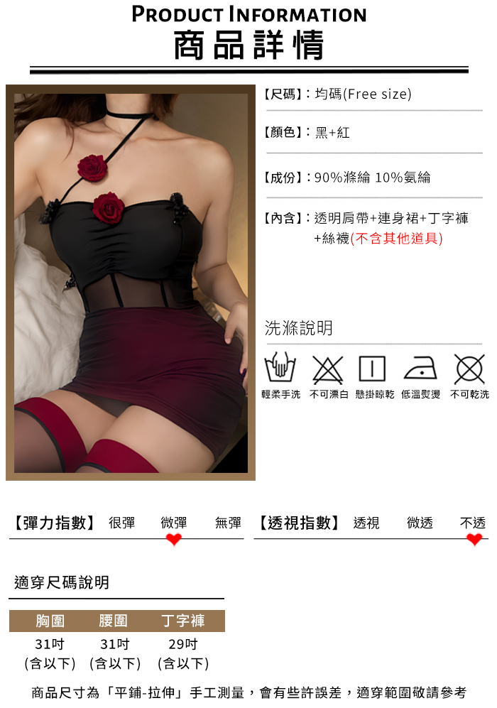 ►您現在的位置:首頁>情趣睡衣!輕紗掩映黑紅玫瑰綴飾透膚薄紗拼接連身裙四件式套裝