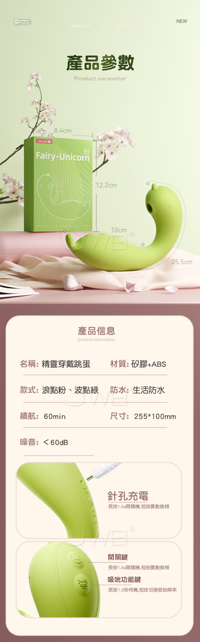 ►您現在的位置:首頁>GALAKU.精靈 獨角獸 10X10 強震吸吮 APP智控加溫 尾端撥點刺激穿戴按摩器【波點綠】