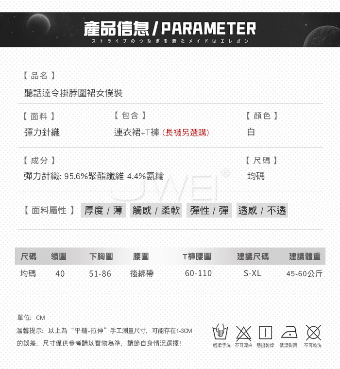 ■內容物:連衣裙+T褲 ■適穿尺寸:FREESIZE ■彈性:彈 ■未撐開平量尺寸正負誤差1~2cm,1吋=2.54cm ■注意事項:基於保障消費者個人衛生,此貼身衣物恕不接受退換貨。 (如為商品本身暇疵,接受七日內換貨,請勿試穿,謝謝您)
