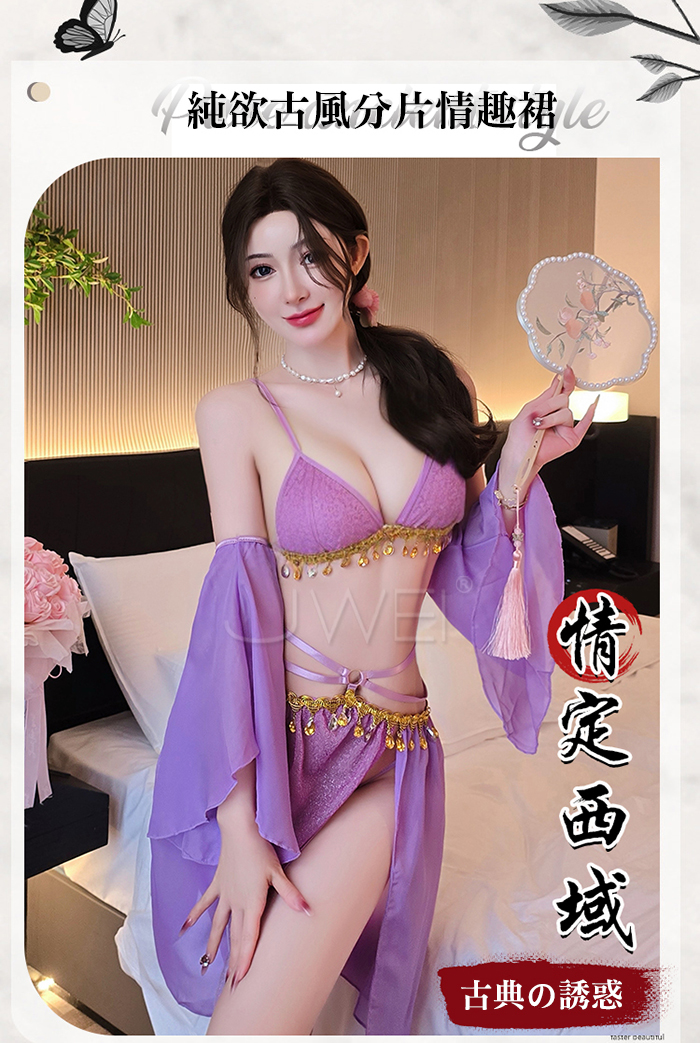 ►您現在的位置:首頁>情定西域.異域風情復古亮片拼接裙擺角色扮演服-紫色【胸罩+短裙+T褲+袖子*2】